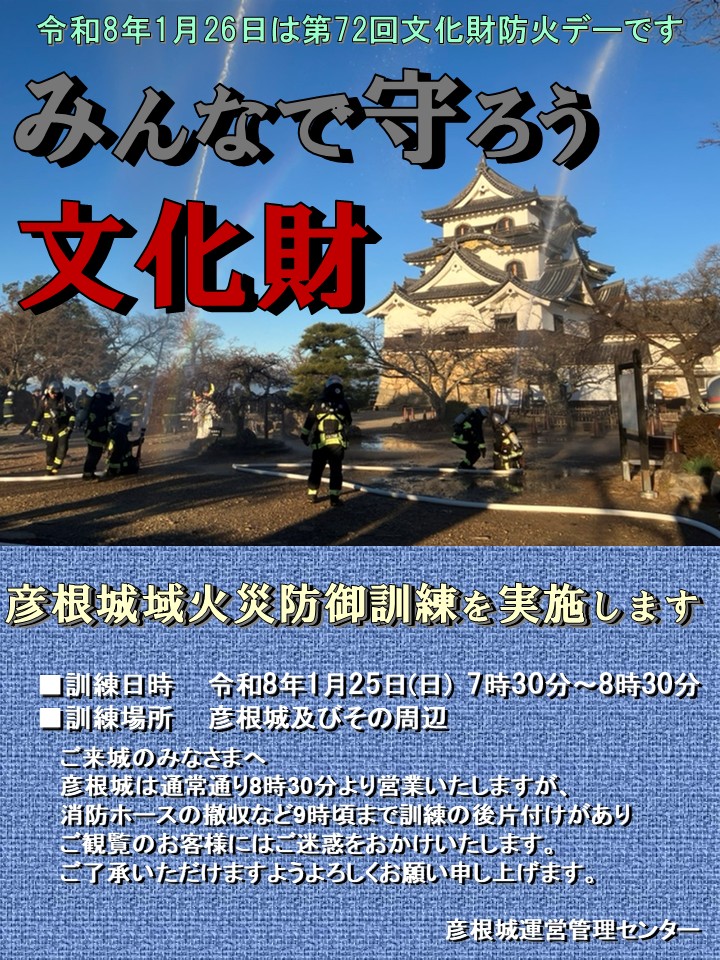 これにあわせて、1月22日(日)8時から9時まで、彦根城、彦根城博物館合同で彦根城域火災防御訓練を実施します。