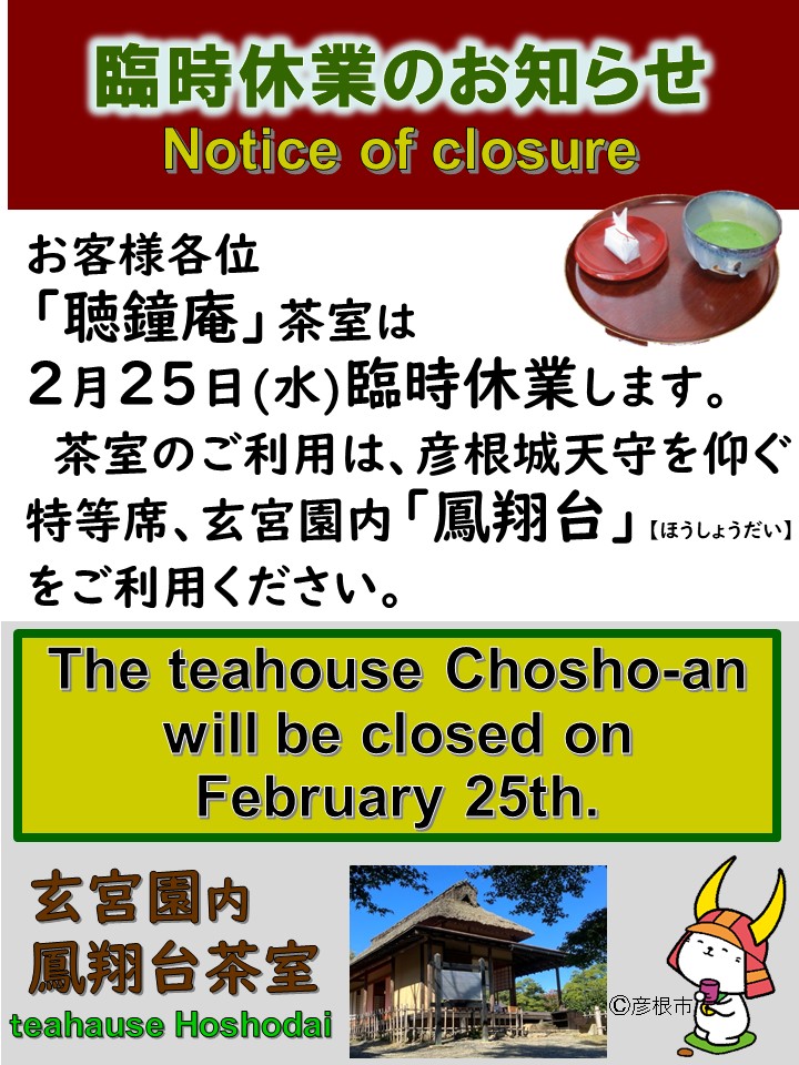 \2月25日(水)聴鐘庵茶室は臨時休業します/